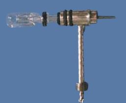 由同轴玻璃雾化器的内管吸入被测溶液,外管接压缩空气,喷口上套有可取下的撞击球帽(不同雾化器间不可互换),玻璃雾化器固定在不锈钢保护套内,不锈钢外形与各型号主机雾化器座相适应,内管插接特制等内径聚乙烯限流进液管,或插接不锈钢管—硅胶管—聚乙烯限流进液管(不易脱落,硅胶管不耐有机溶剂)。